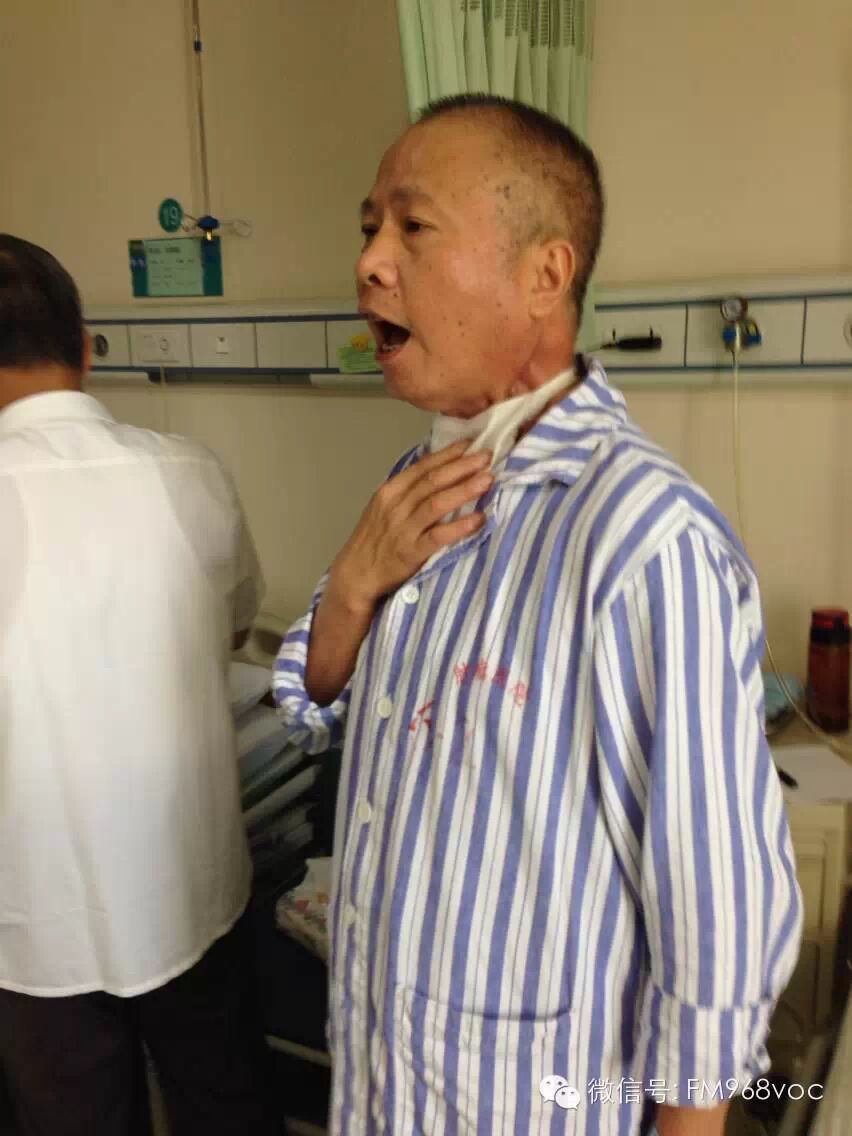 图:这是“食管发声训练班”里第一个重获新“声”的学员何祥勇。老何今年46岁,是一名技术一流、为人耿直的木工师傅,专门从事家装行业。去年2月份,他因罹患喉癌而被迫切除了全部喉咙。尽管失去语言能力令他一度小陈,但经过医护人员的鼓励,一个月后打嗝声响亮,三个月后能发一个音,五个月后能断断续续说三个字,七个月后可以说一句连贯的话……