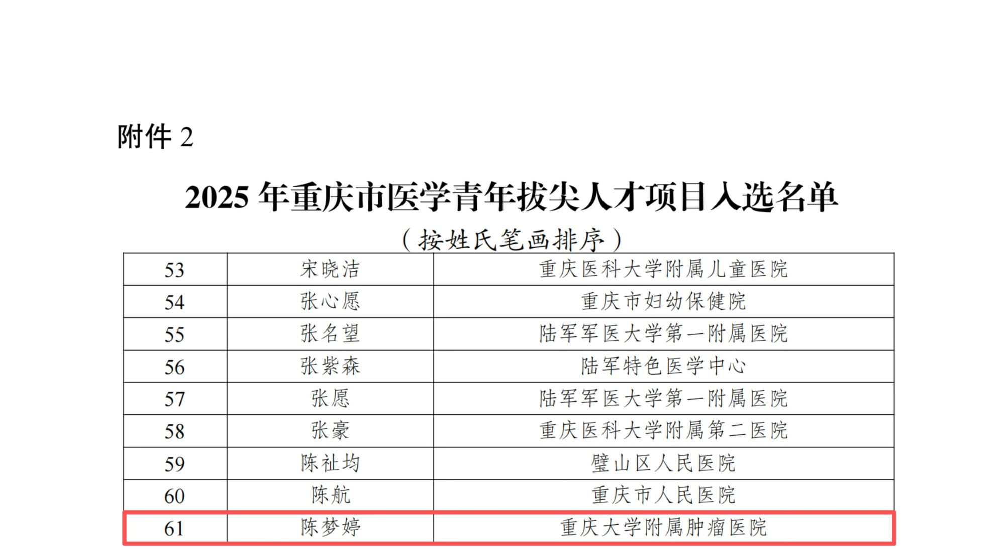 近日,根据《重庆市卫生健康委员会办公室关于印发 2025 年重庆市中青年医学高端人才项目和青年拔尖人才项目入选名单的通知》(委办(2025—105),重庆大学附属肿瘤医院营养科余慧青教授团队陈梦婷博士入选2025 年重庆市医学青年拔尖人才项目。