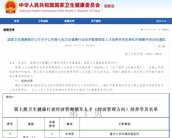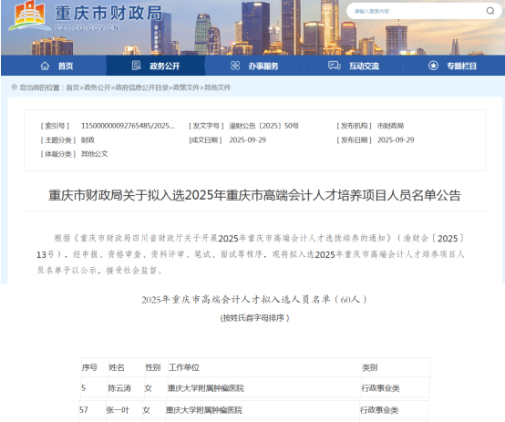 重庆大学附属肿瘤医院财务科1人入选国家级经济管理类人才培养项目,2人入选市级经济管理类人才培养项目